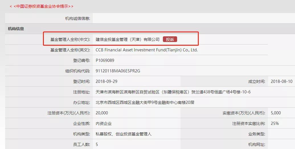 协会备案信息显示,建信金投基金管理(天津)有限公司(简称“建信金投基金”)成立于2018年8月10日,随后于9月29日就在中国证券投资基金业协会完成私募基金管理人登记。