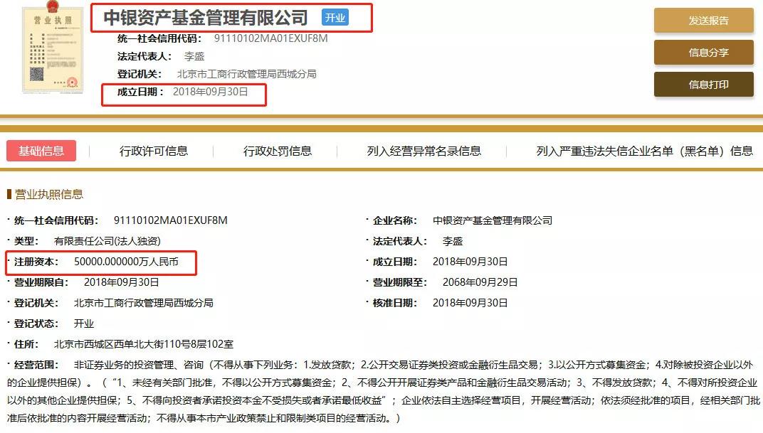 资料显示,中银资产基金成立于2018年9月30日,由中银金融资产投资有限公司100%控股,注册资本金为5亿元,法定代表人为李盛。