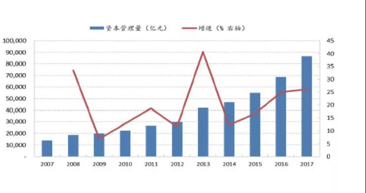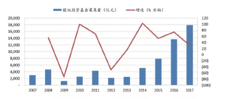 图表2:2007-2017年,股权投资市场资本管理量呈现逐年上升的趋势