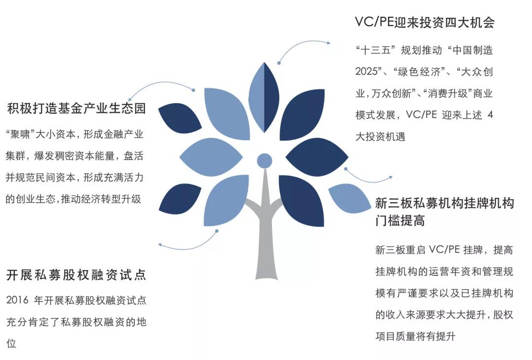 中国政府积极鼓励股权投资的发展。2016年开展的私募股权融资试点工作,充分肯定了私募股权融资的地位,并在政府相关报告与发展计划中指出,将加大对股权投资发展的促进力度,扶持人工智能、智能制造等新产业成长。并积极打造基金产业生态园,盘活民间资本,推动经济转型升级。而新三板私募机构和挂牌机构门槛的提升也有助于提升股权项目的质量。
