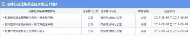 2017年8月30日,国务院法制办、证监会起草的《私募投资基金管理暂行条例(征求意见稿)》及其说明全文公布,征求社会各界意见。