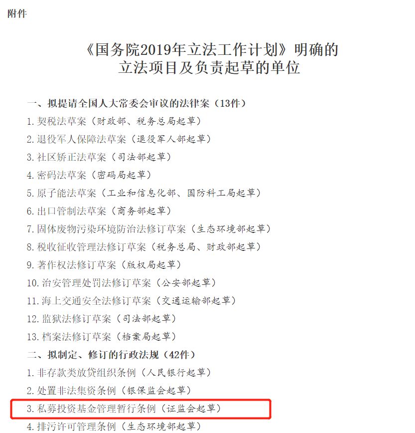 2019年5月11日,国务院办公厅发布《关于印发国务院2019年立法工作计划的通知》显示,《私募投资基金管理暂行条例》列入国务院2019年立法工作计划,为《国务院2019年立法工作计划》已明确的55件立法项目中唯一由证监会负责起草的立法项目。