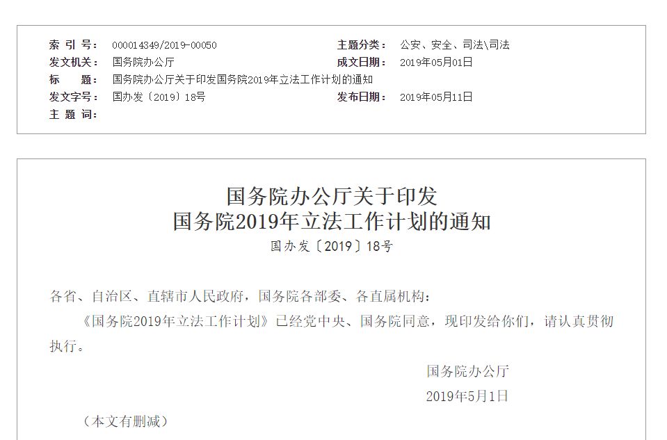 5月11日,国务院办公厅印发关于国务院2019年立法工作计划的通知(国办发〔2019〕18号。