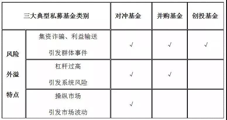 由上表可见,对冲基金作为可流通证券类私募基金的典型代表,除了可能因为涉及集资诈骗、利益输送引发群体事件外,还可能因为杠杆过高引发系统风险,因为操纵市场引发市场波动;并购基金由于只以非公开交易的“私人股权”作为交易对象,因而不存在操纵市场引发市场波动的风险,但由于所并购企业往往是成熟行业中的成熟企业特别是陷入困境中的企业,完全靠企业自身经营难以实现高资本增值,因而往往需要诉诸杠杆来提升资本回报,所以,有可能存在杠杆过高引发系统风险的问题;创投基金由于所投资创业企业本身就具有高成长,因而往往无需诉诸杠杆来提升资本回报,加之被投资企业既缺乏足够资产可供抵押,又很难寻求第三方担保,因而想搞杠杆也不具有现实性,所以,连杠杆过高引发系统风险的问题也不存在,其唯一的风险就只是可能涉及集资诈骗、利益输送引发群体事件。