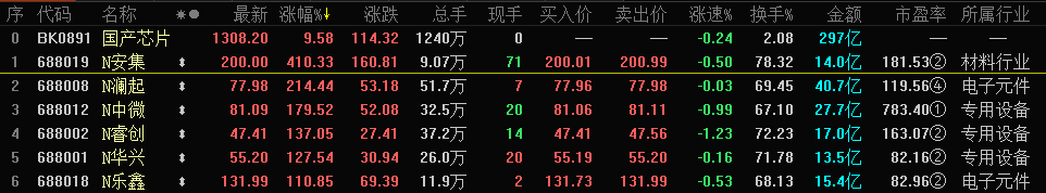 这6家自带光环的芯片企业创下了多项资本市场记录。例如,安集科(688019.SH)技盘中10:39分曾一度创下520.57%的上涨幅度,股价为243.20元/股,这一数据超过了目前的创业板新股王卓胜微,而后者6月18日才刚刚登陆创业板,一个多月的时间,其在一哥的位置上还没有坐稳就受到了潜力新星的挑战。尤为注意的是,此前在安集科技网上申购缴款期间,出现投资者弃购的情况,当时放弃认购数量为5113股,按今日最高价计算,相当于每股损失204.01元,总金额达104.31万元。